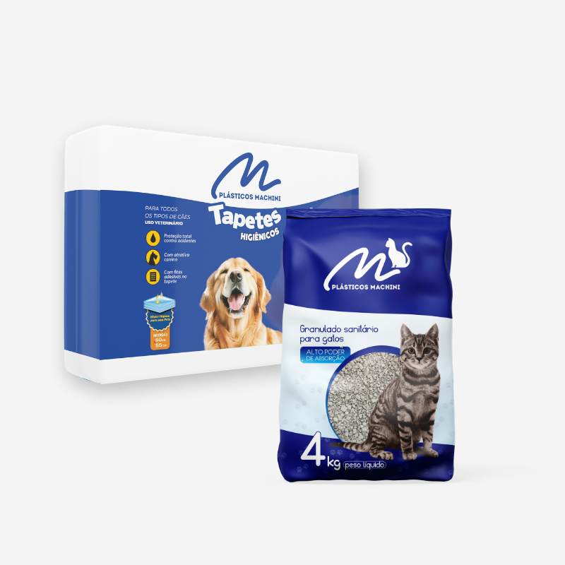 Linha de Embalagens: Ração, Tapete Higiênico, Areia para Gatos, Petiscos e Snacks.